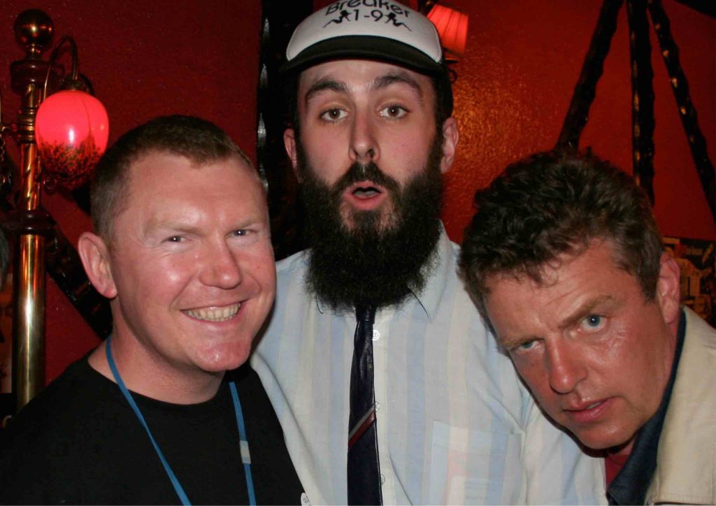 A 2007 camera phone captures the performance and below, Henry Conlon, Scroobius Pip and Suggs back stage