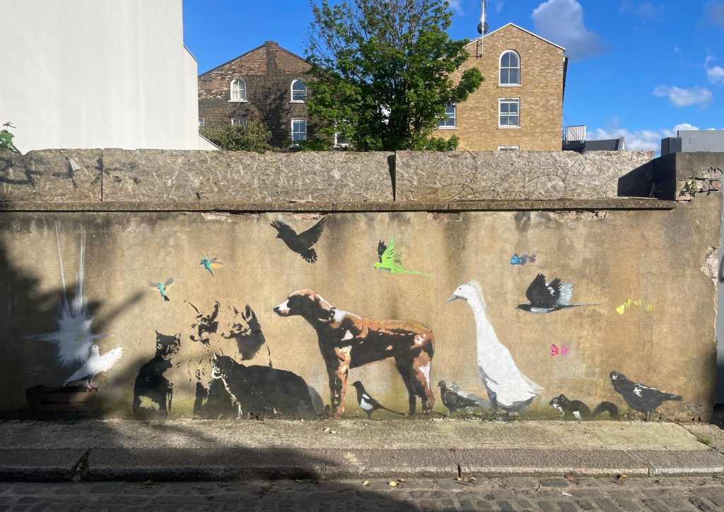 The mural depicts a dove-pigeon speaking peace to the other animals like a prophet or Jesus speaking to disciples. Titled Urban Animal Mythology, it is the first of a new series by Loretto. He said he came across the wall by accident and “fell in love” with its natural cracks, rough surface and the way the sunlight falls on it, which add to the fantastical spirit of the animals. “I was just coming this way really,” said Loretto. “I didn’t go searching to do pictures in Camden. I see this wall. I was like falling in love with this wall to be honest, because it’s so beautiful. If you paint this on a very renovated wall you kill the sensation.”