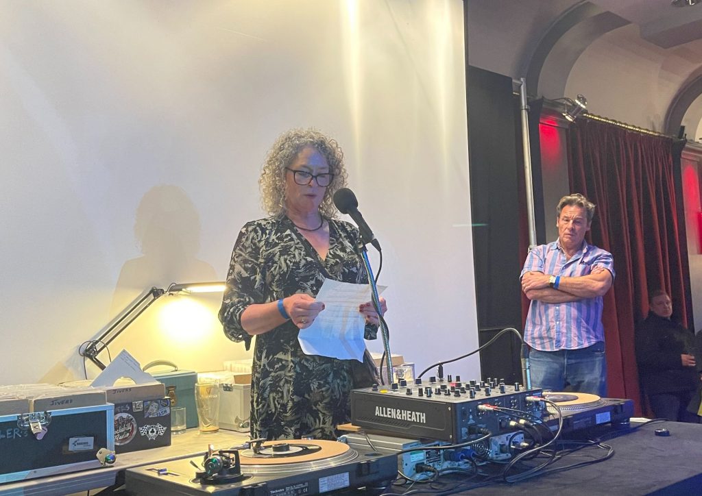 “Thank you to my girlfriends and to my family and my kids who encouraged and supported me to put on the event,” she said. Ms Leigh-Coggin then spun the first record that Stephen ever bought when he was 12 years old: Rock Around the Clock by Bill Haley and His Comets, which he bought from WHSmiths in Kilburn High Road. She met Stephen and Ms Morrissey at school when she was seven years old.