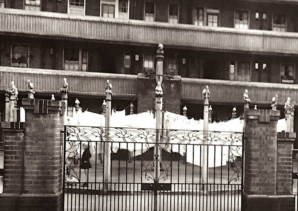 Other courtyards had a focus on nursery rhymes, while in Chalton Street, a statue of St Anthony overlooks the St Anthony’s flats courtyard. The saint once gazed over a circle of washing posts topped by finials with a fish motif.