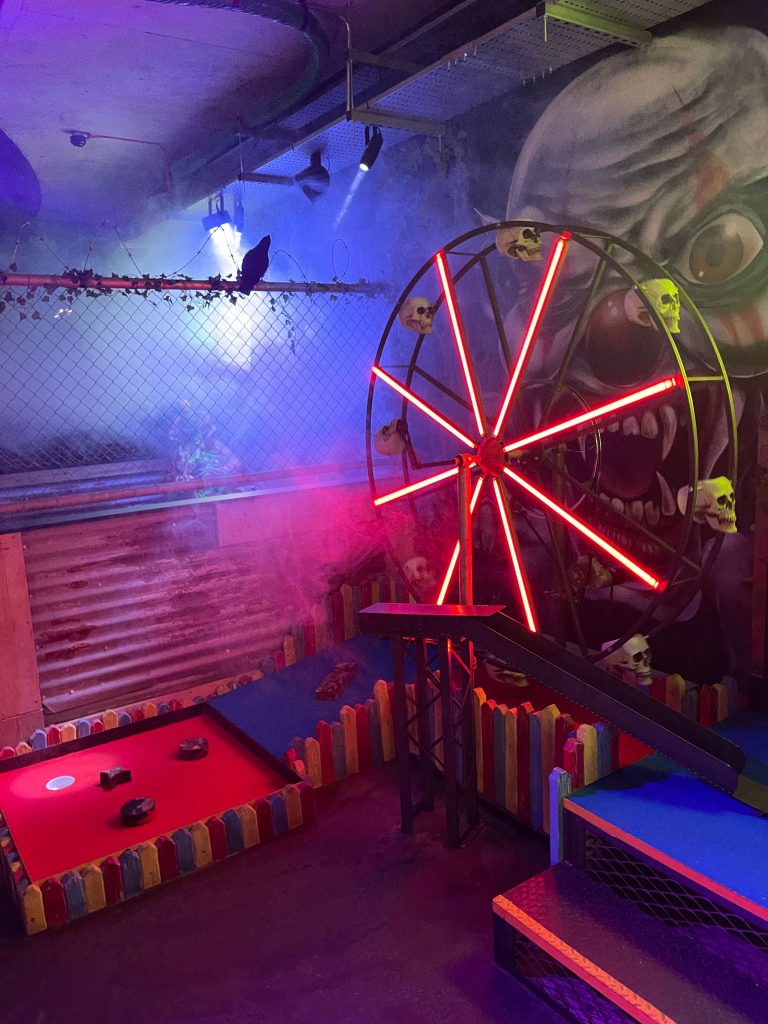 Our golf balls shot out of cannons, looped around a skull carousel, and whizzed through a mirror maze. The course was set against an eerie backdrop created by smoke machines, and a less menacing disco soundtrack.