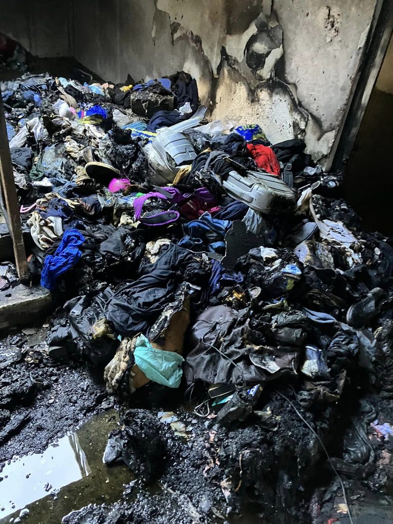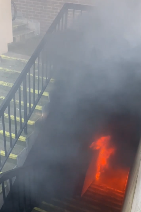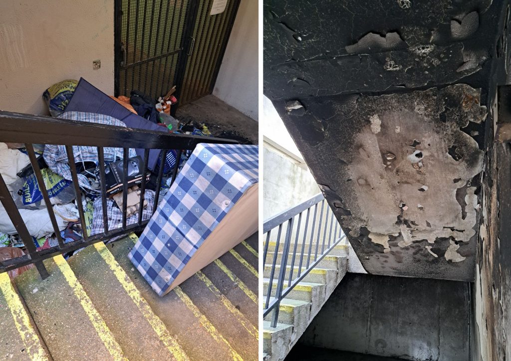 The fire in the stairwell and, below, the burned rubbish [Both pics: ❤️Camden Facebook group]
