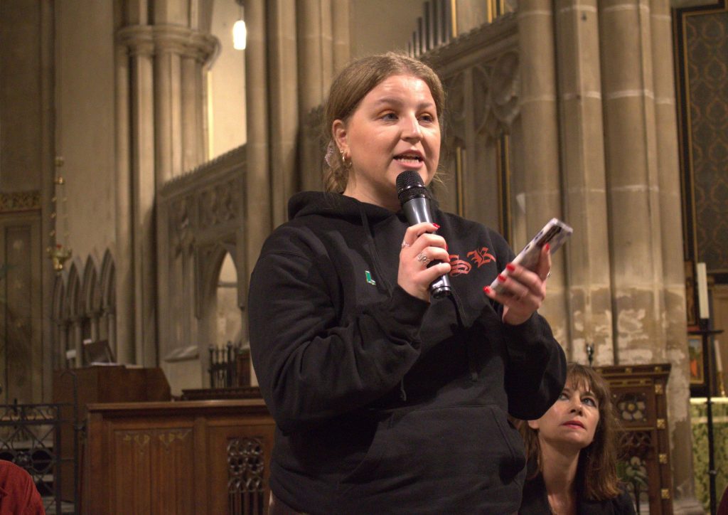 Camden Council’s acting leader Councillor Pat Callaghan addresses the public meeting in St Michael’s Church in Camden Town