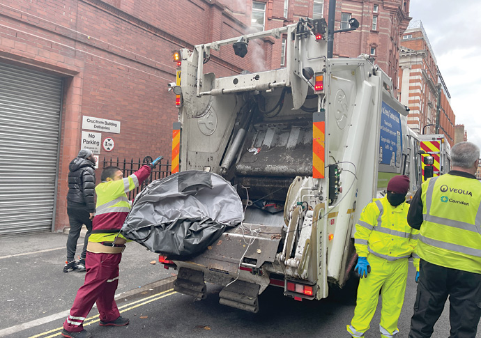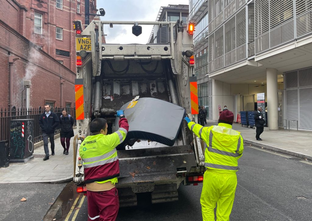 Last week, we reported how we had witnessed 12 tents, most filled with belongings, dumped into the back of a Veolia bin truck during the eviction of people experiencing homelessness from the rear of University College London Hospitals in Huntley Street.